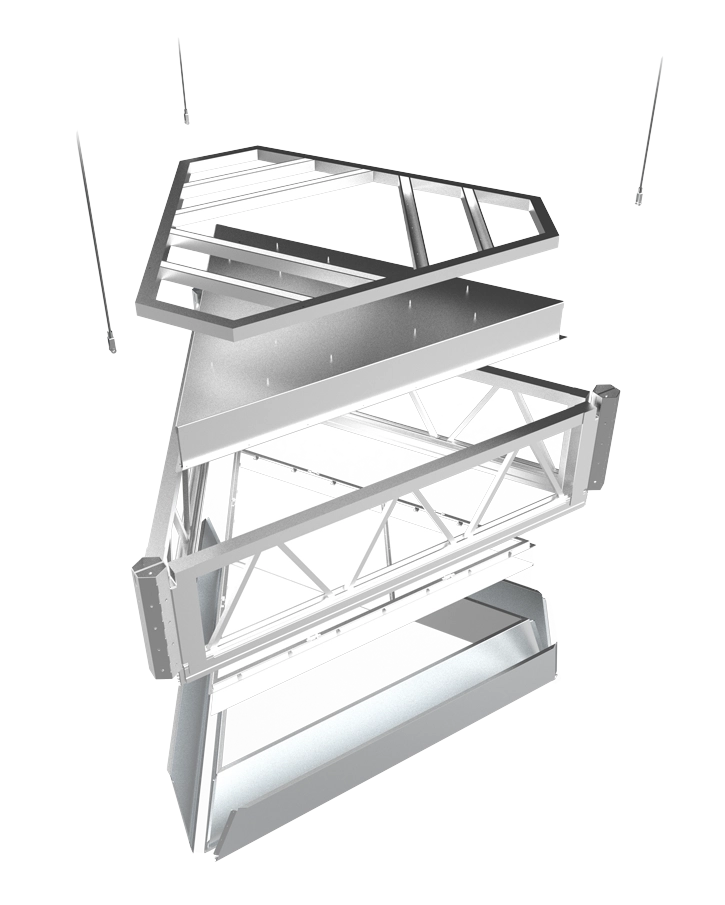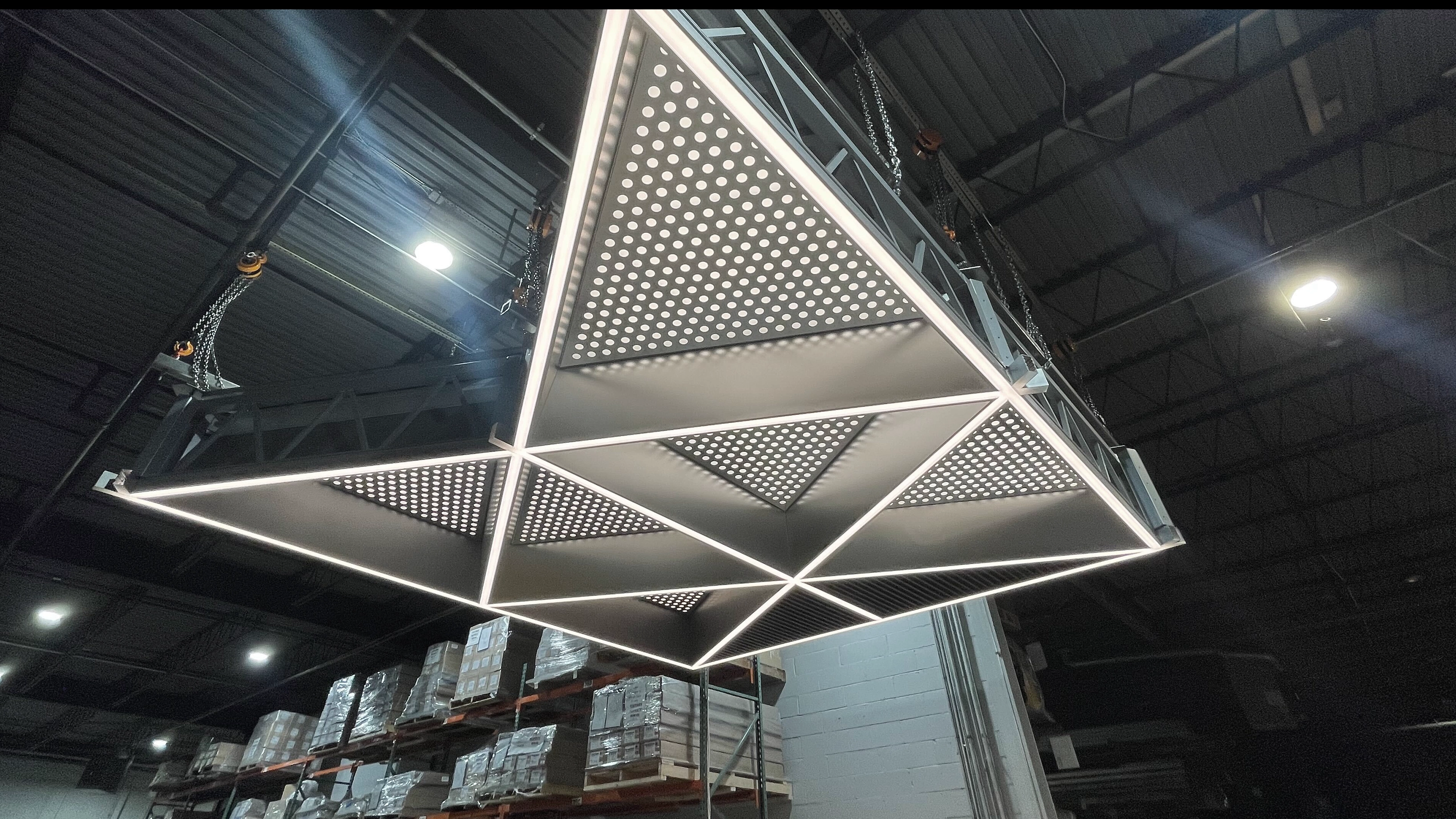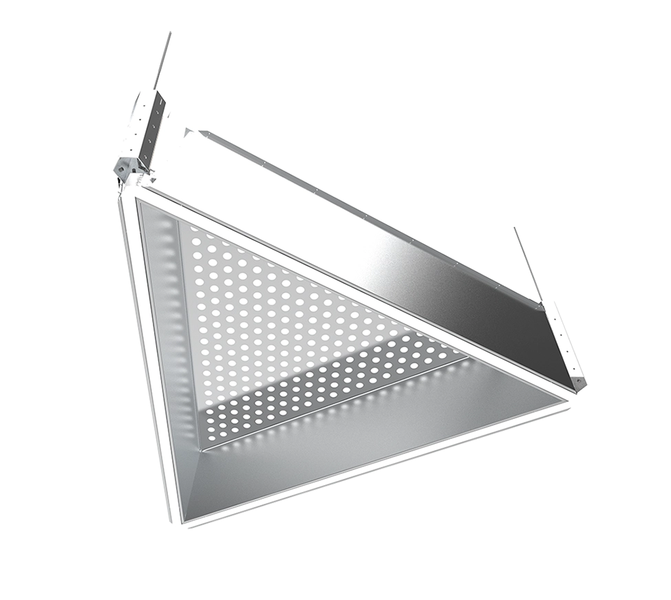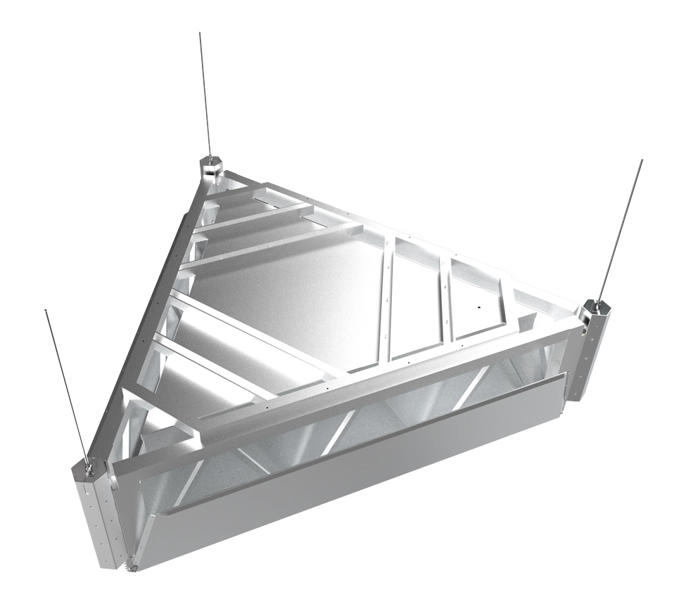 The triangular diffuser panels for the "light scape" fixtures are so large that they exceed both the specified roll width for Alanod Mirro 20 as set by the architects and the manufacturer's laser cutter bed size. They were formed from custom finished stainless steel to match the surrounding Alanod finishes. All internal structures of the 'Light scape" fixtures were specifically designed to prevent cast shadows and allow for maintenance access after installation. All components were optimized for manufacturing the complete assembly is composed of geometric patterns of 18 antique subassemblies and 70 custom parts forming a structure of over 12,000 parts.