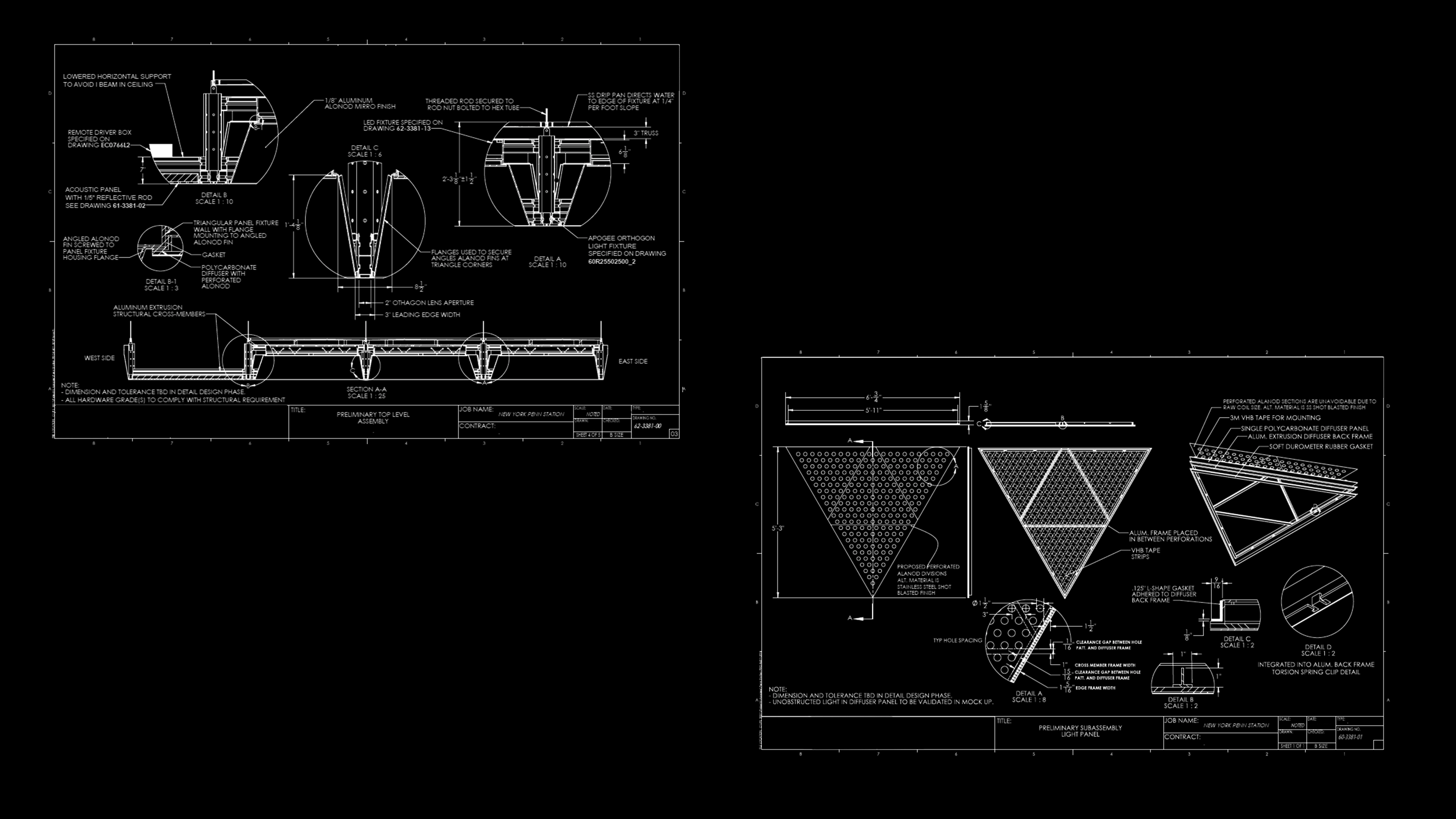 Each component was scrutinized for structural robustness with attention to assembly approach from the very start. Multiple assembly approach revisions, detailed CAD drawings, and specification documents helped to streamline this lighting concept framework in order to allow first prototype sample section to be built for testing and validation.