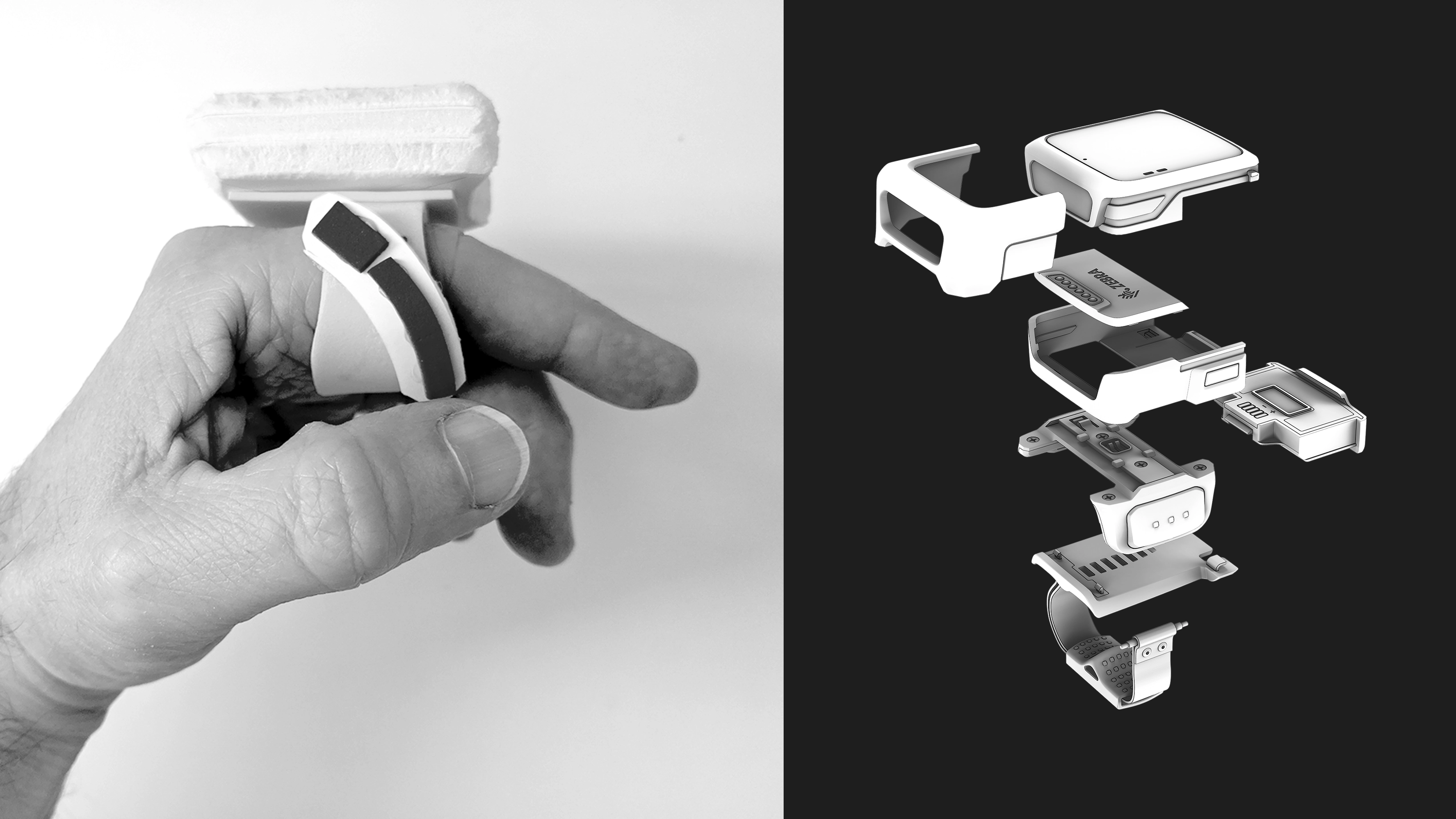 Our collaboration with Zebra on their WS50 RFID wearable computer involved overcoming a multitude of design challenges to create a cutting-edge device: a modular, enterprise-class Android computer untethered to additional data capture and retrieval devices and thus inherently safer than existing solutions on the market. The WS50's modularity posed unique challenges, as it needed to accommodate various battery sizes and RFID module functionalities while also facilitating different hand orientations to accomplish different tasks. Among the most critical of these challenges was ensuring the finger-worn device struck the perfect balance between ergonomics and functionality; meeting user experience needs while satisfying the practical demands of various work environments; successfully addressing the inherent tension between workplace shift duration and the impact of battery life/weight on the employee. Our team successfully navigated these complexities, contributing to the device's versatility and adaptability across a diverse set of user needs, including those outside the targeted use cases. For example, the modular design also allows users to transform the core module into different form factors, such as a watch or lanyard, providing unmatched flexibility in how the wearable computer is deployed. Additional consideration was given to the demands imposed by some of the workplace environments. In particular, to safeguard the screen, innovative glass protection solutions were developed, seamlessly integrating device usability and durability without compromising on other elements of the design. Of course, incorporating user-friendly elements, such as visual and audio cues, adds a delightfully practical dimension to the WS50's user experience, enhancing not only functionality but also driving user engagement by making the device intuitive and enjoyable to use.